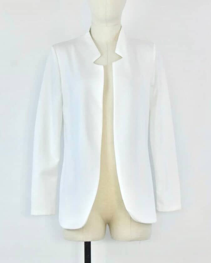 Prečiščen blazer brez zapenjanja navduši z modernim, minimalističnim dizajnom. Raven kroj omogoča udobno nošenje in enostavno kombiniranje. Poseben izrez pri ovratniku doda subtilno eleganco. Idealen je za plastenje in ustvarjanje sofisticiranih videzov.