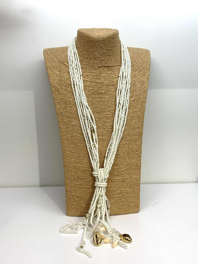 Elegantna večvrstna ogrlica v nežnih belih tonih izžareva prefinjeno naravnost in brezčasni poletni značaj. Drobne steklene perlice so združene v mehko padajoče niti, povezane z dekorativnim vozlom, ki se zaključuje z igrivimi obeski v morskem navdihu. Ogrlica je lahkotna, a izrazita ter se lepo poda tako k lanenim oblačilom kot tudi k bolj minimalističnim večernim kombinacijam.
