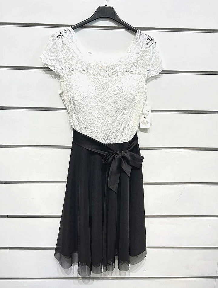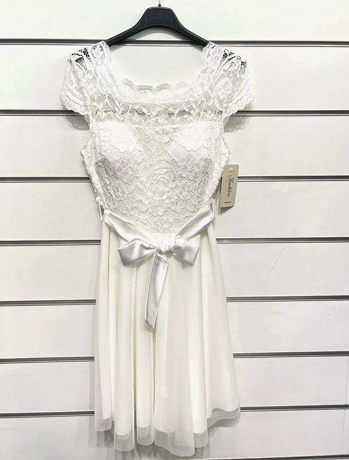 Preprosta in ženstvena kratka obleka s čipkastim zgornjim delom in kratkimi rokavi, ki doda nežno eleganco. V pasu jo krasi satenast trak, zavezan v ljubko mašnjo, ki nežno poudari postavo in vnese igriv, prefinjen detajl.