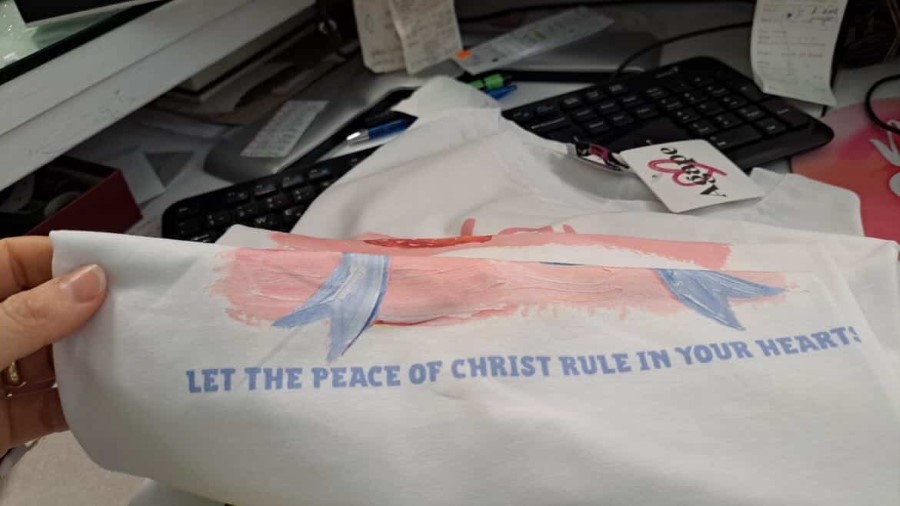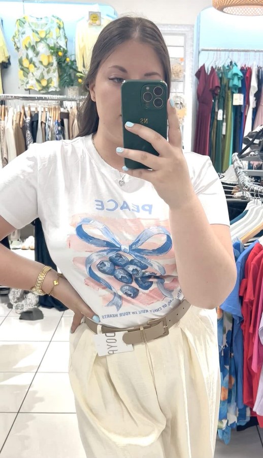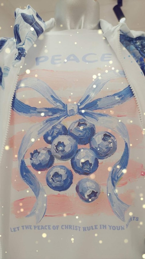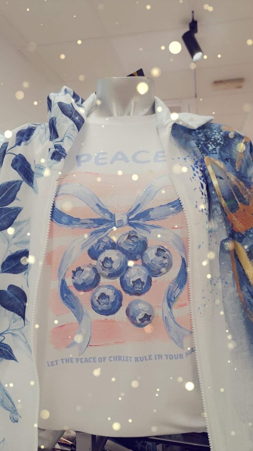 Bela majčka z elegantnim motivom borovnic prinaša nežno kombinacijo barv in sporočilnosti. Na sprednji strani jo krasi umetniški potisk borovnic, povezanih z modro pentljo, ter napis »PEACE«, ki simbolizira mir in harmonijo. Na spodnjem delu je dodan tudi navdihujoč citat iz Svetega pisma: »Let the peace of Christ rule in your hearts«.