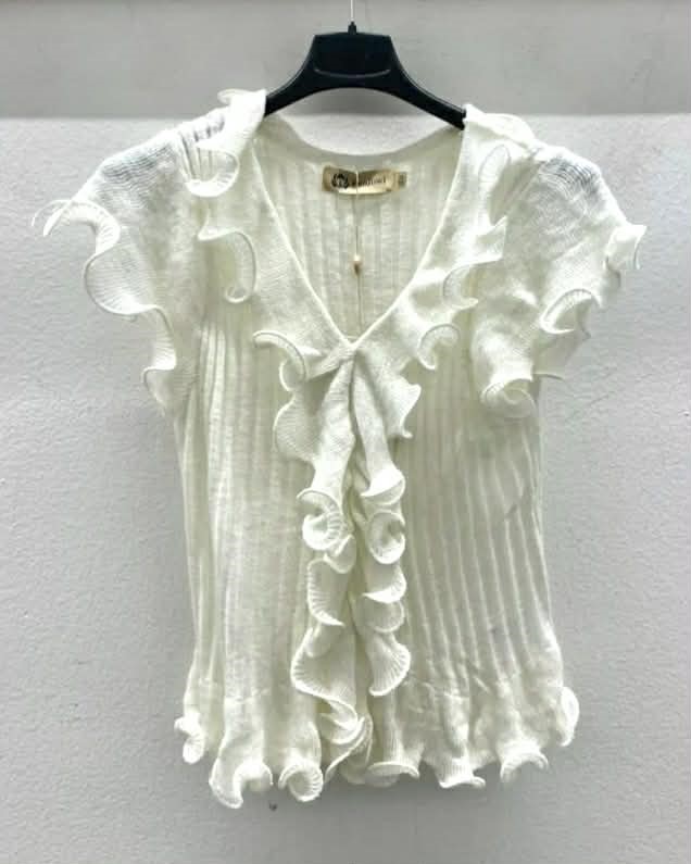 Bela bluzica z drobnimi gubami in nežnimi volančki na robovih, izdelana iz lahkega, udobnega bombaža.