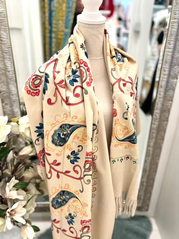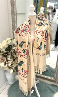 Elegantna izbira za vsak dan – bež šal z vzorci združuje klasično barvo in subtilno izražen dizajn. Mehka, lahkotna tkanina lepo pade in se udobno nosi, vzorci pa dodajo ravno pravšen poudarek, ki šal loči od običajnih enobarvnih modelov. Odličen za poslovne ali sproščene stilske kombinacije.