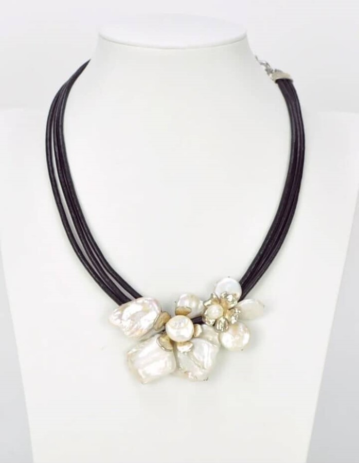 Ogrlica je izdelana iz več črnih vrvic, ki se združujejo v bogat osrednji motiv. Okrašena je z nepravilnimi sladkovodnimi biseri v naravni beli barvi. Kovinski detajli v zlatem tonu nežno povezujejo posamezne elemente. Zapira se s kovinsko zaponko za varno nošenje.