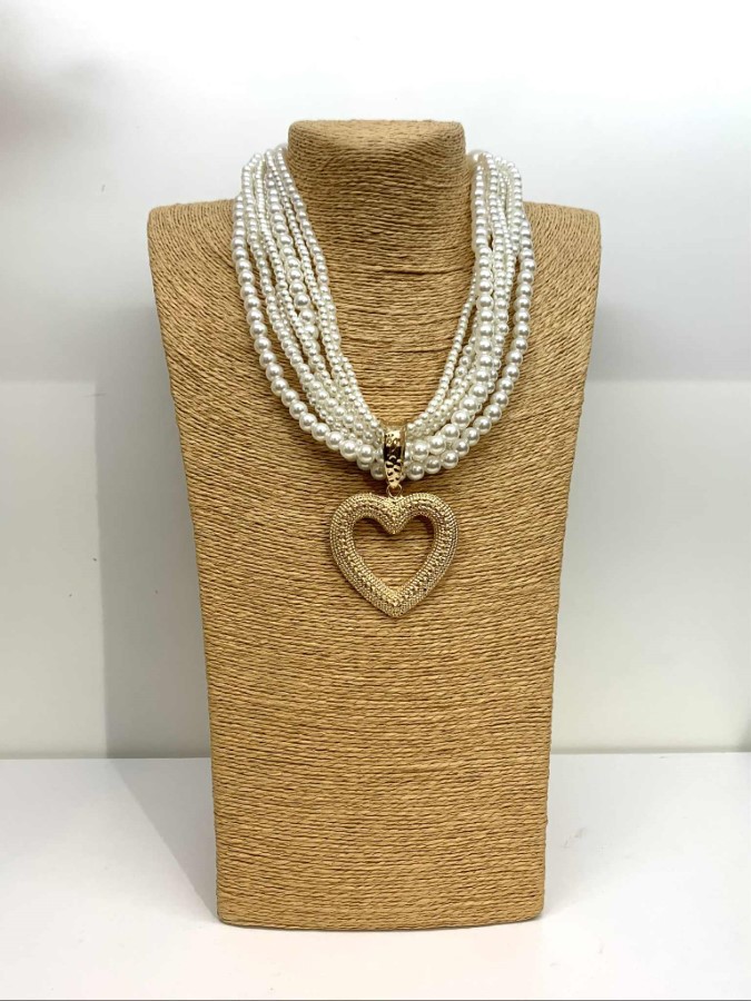 Elegantna večplastna ogrlica iz biserov je prefinjen kos, ki združuje brezčasno klasiko in sodoben luksuz. Več nizov sijočih umetnih biserov se nežno prilega vratu in ustvarja bogat, a uravnotežen videz, osrednji poudarek pa predstavlja srčkast obesek v zlati barvi z nežno teksturirano površino, ki ogrlici doda ženstven in butičen značaj.