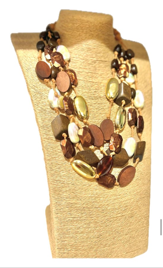 Ta večvrstna ogrlica združuje naravne lesene kroglice, kovinske detajle in svetleče perle, kar ji daje sofisticiran in hkrati rustikalen videz. Zaradi svojega bogatega dizajna je idealna za popestritev preprostih oblačil ali kot izstopajoč dodatek k posebni priložnosti. Ročno izdelana, zagotavlja edinstven in kakovosten kos nakita, ki bo pritegnil poglede.