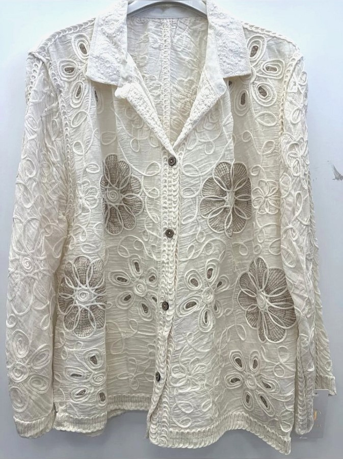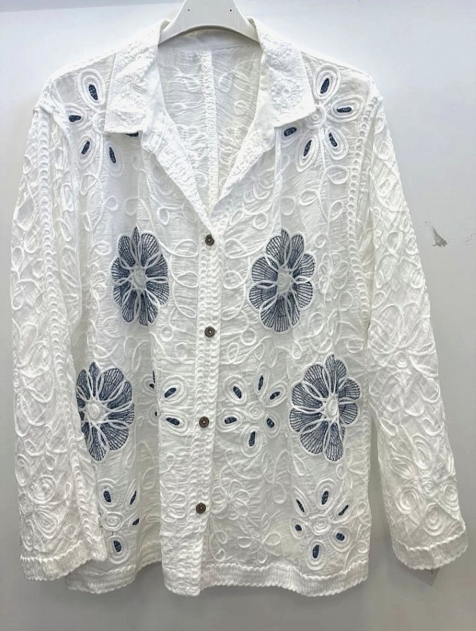 Srajca iz bogato teksturirane čipke z dekorativnimi cvetličnimi vzorci. Klasičen ovratnik in zapenjanje na gumbe ustvarjata eleganten videz. Trije četrtinski rokavi dodajo pridih lahkotnosti in prefinjenosti. Izstopajoč kos za posebne priložnosti ali sofisticiran vsakdanji stil.