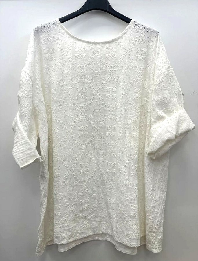 Lahkotna bela tunika z nežnim čipkastim vzorcem ustvarja eleganten in zračen videz. Ohlapen kroj in kratki rokavi zagotavljajo udobje skozi ves dan. Okrogel izrez dopolnjuje minimalističen stil, ki se enostavno kombinira. Popolna izbira za sveže, poletne outfite.