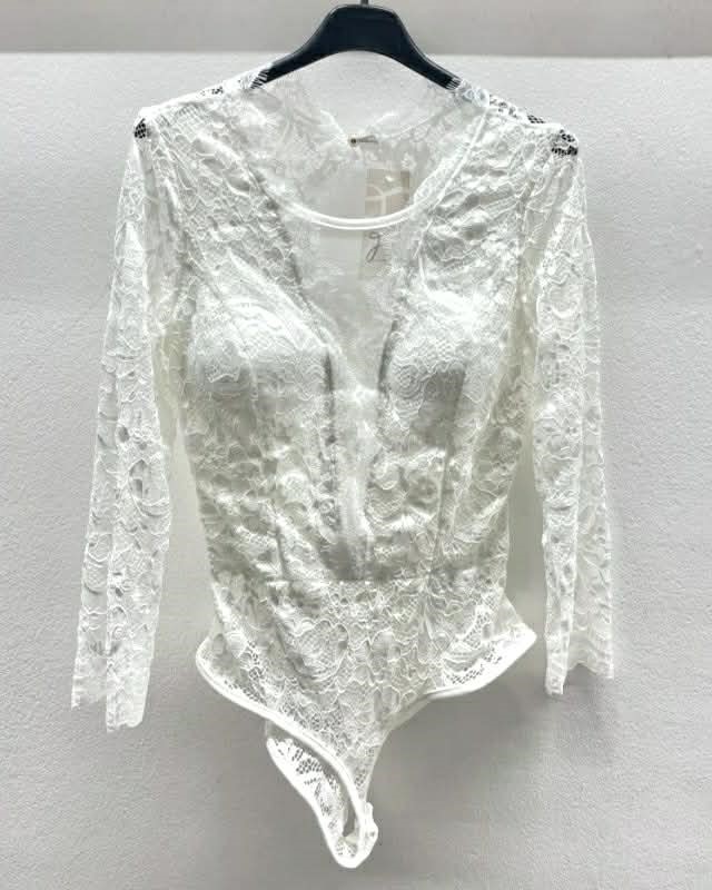 Lahkotni čipkasti bodi iz prosojnega materiala, ki nežno objame telo. Dolgi rokavi in elastičen pas omogočajo udobno prileganje. Popoln za elegantne kombinacije in večerne priložnosti.