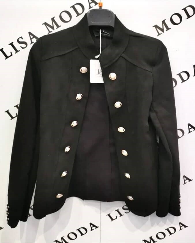 Večna klasika s pridihom razkošja. Čista linija, prefinjena črna in kontrastni zlati gumbi ustvarjajo videz, ki je hkrati eleganten in močan. Kos, ki vedno naredi vtis.