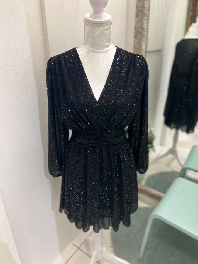 Elegantna črna obleka z drobnim bleščečim vzorcem, ki deluje prefinjeno in ženstveno. Preklopni kroj z globljim V-izrezom lepo poudari dekolte, nabran pas pa optično zoža silhueto in ustvari lepo oblikovano linijo telesa. Dolgi rokavi in lahkotno, rahlo razširjeno krilo poskrbijo za eleganten videz z nežnim pridihom glamurja.