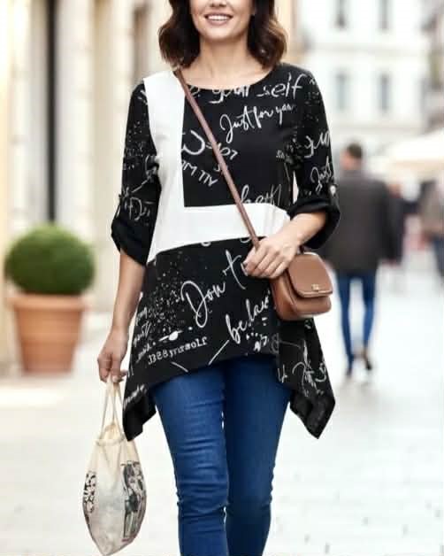 Trendovska tunika z izrazitim grafičnim potiskom in kontrastnim detajlom na sprednji strani. Mehka in prijetna tkanina omogoča udobno nošenje ob različnih priložnostih. Asimetričen zaključek ustvari dinamičen in mladosten videz. Odlično se kombinira z jeansom in torbico za sproščen mestni outfit.