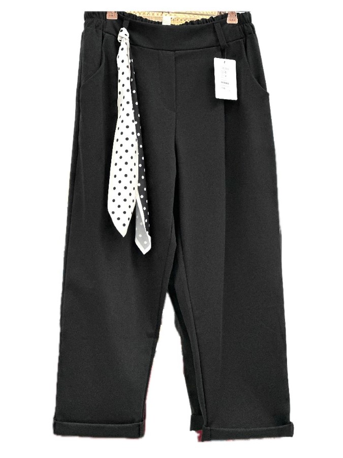 Te črne hlače z modernim polka pikčastim pasom so prava izbira za vsakodnevne priložnosti, ki zahtevajo nekoliko bolj sproščen, a še vedno elegantni videz. Imajo širši kroj, ki zagotavlja udobje in svobodo gibanja, medtem ko pas z grafičnim dizajnom doda igriv in moderen pridih. Natančno zasnovane z drobnimi detajli, kot so zavihani robovi, so odlične za kombiniranje s preprostimi ali trendovskimi zgornjimi kosi. Udoben material in skrbno zasnovan kroj zagotavljata dolgotrajno nošenje in eleganten videz skozi ves dan.