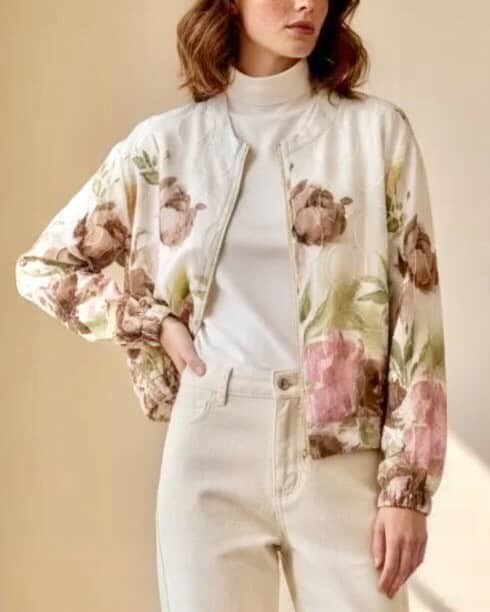 Ta nežna cvetlična bomber jakna je popolna izbira za pomladne dni, ko želite ohraniti eleganco in sproščenost v enem kosu. S svojim cvetličnim potiskom in lahkotnim materialom bo dodala prefinjen videz vsakemu outfitu, medtem ko elastika na robu in rokavih zagotavlja udobje in prilagodljivost.