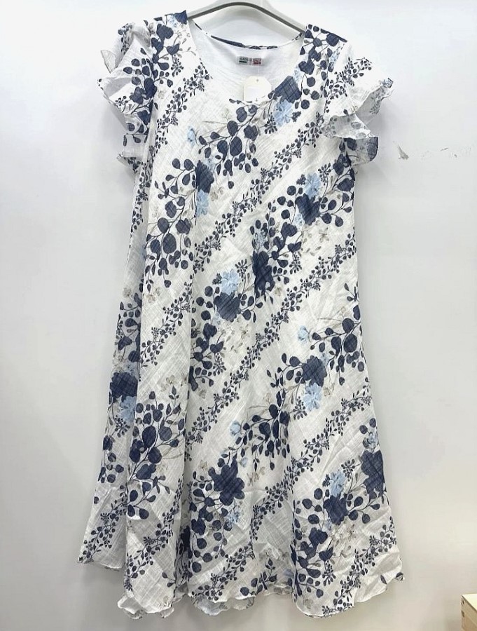 Romantična obleka z nežnim cvetličnim potiskom in kratkimi volančkastimi rokavi. Lahkoten material zagotavlja udobje in zračen občutek pri nošenju. Rahlo razširjen kroj lepo pade ob telesu in poudari ženstveno silhueto. Idealna izbira za tople dni in sproščene priložnosti.