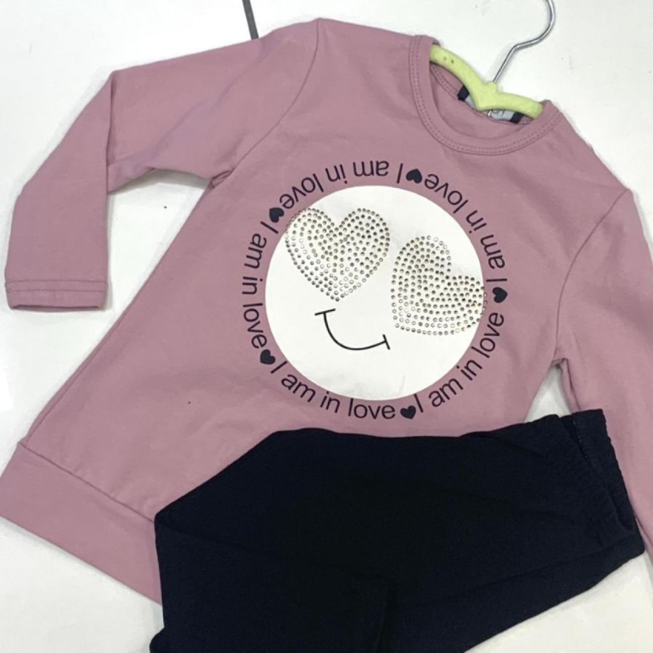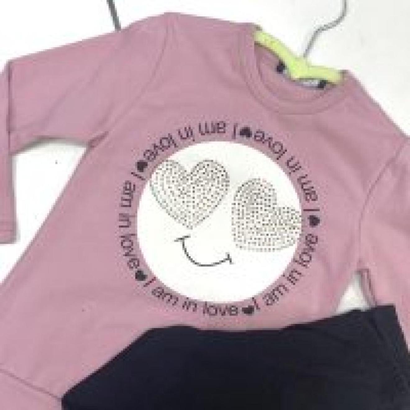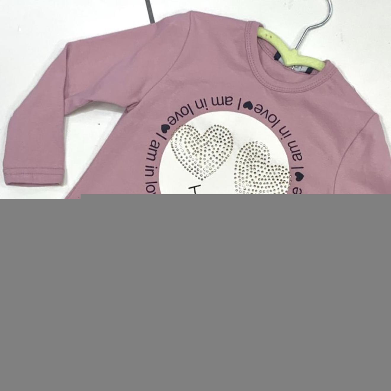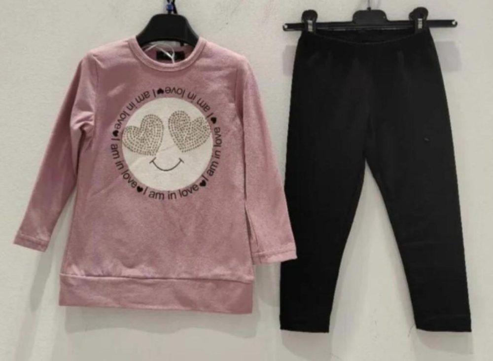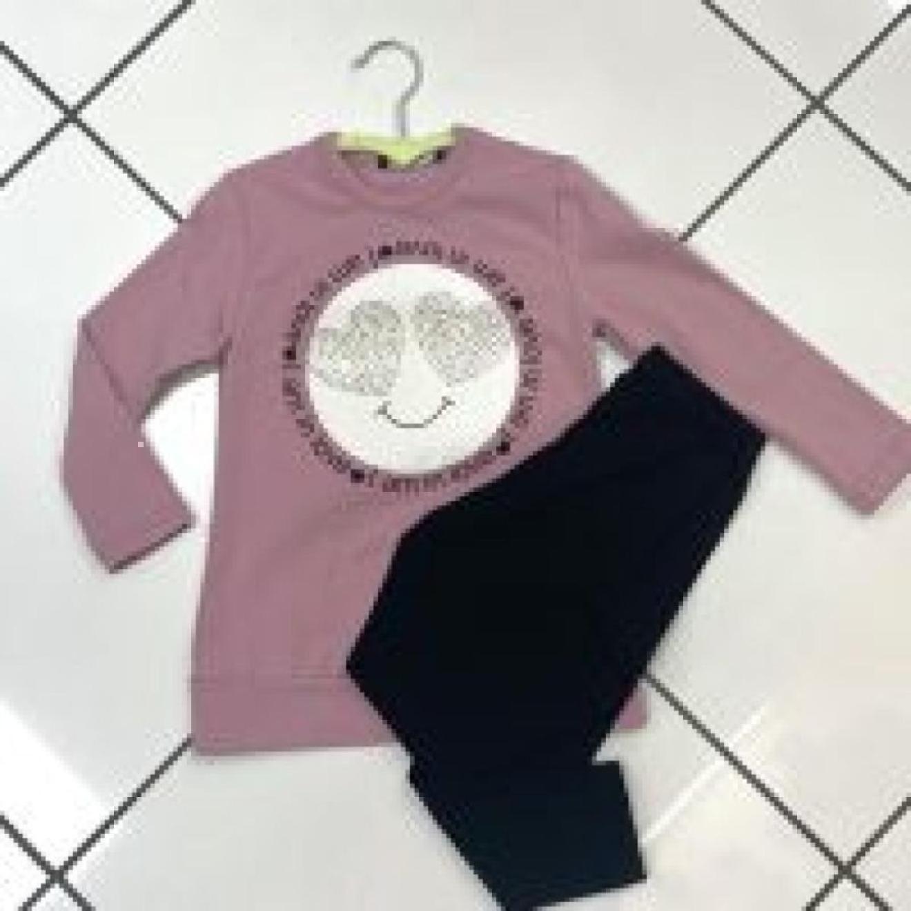 Dekliški roza komplet z dolgimi rokavi je iz mehkega in toplega materiala. Zgornji del je okrašen s potiskom in bleščicami.