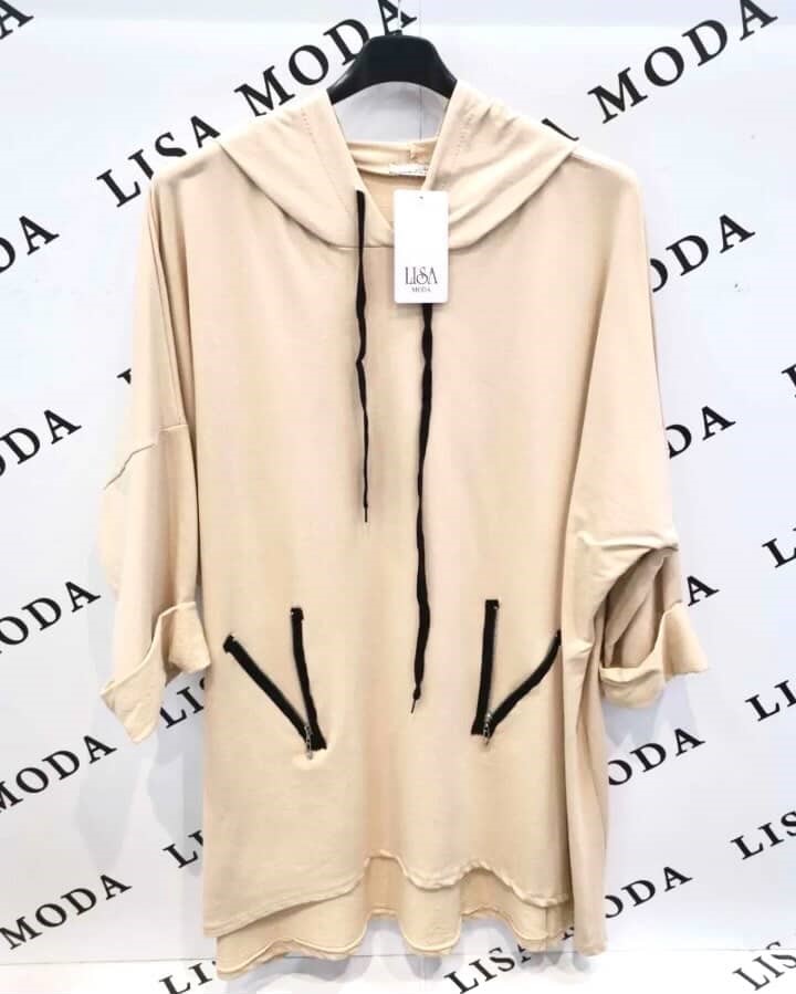 Mehka tunika s kapuco je izdelana iz prijetnega, zračnega materiala na osnovi bombaža z dodatkom elastana. Tkanina je rahlo raztegljiva, kar omogoča udobno prileganje in svobodo gibanja. Površina je gladka in nežna na otip, primerna za vsakodnevno nošenje. Material ohranja obliko in nudi dolgotrajno udobje.