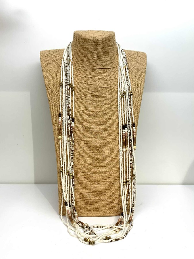 Ta večplastna ogrlica v toplih naravnih odtenkih bele, bež in rjave deluje subtilno, a izjemno elegantno. Drobne perlice, ritmično prepletene z manjšimi kovinskimi poudarki, ustvarjajo lahkoten, boho navdihnjen videz, ki se lepo poda tako k vsakodnevnim kombinacijam kot tudi k bolj urejenim stilom. Ogrlica je prijetna za nošenje in zasnovana tako, da nežno poudari linijo vratu brez pretirane teže ali sijaja.