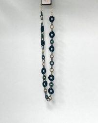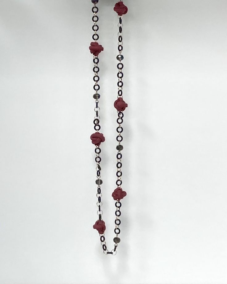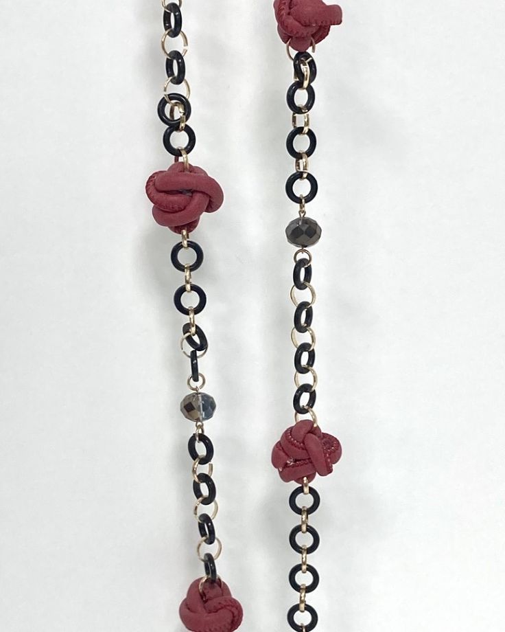 Dolga ogrlica z rdečimi vozli je lahka za nošenje. Ogrlico sestavljajo tudi črni kristali ter črni in zlati obročki.