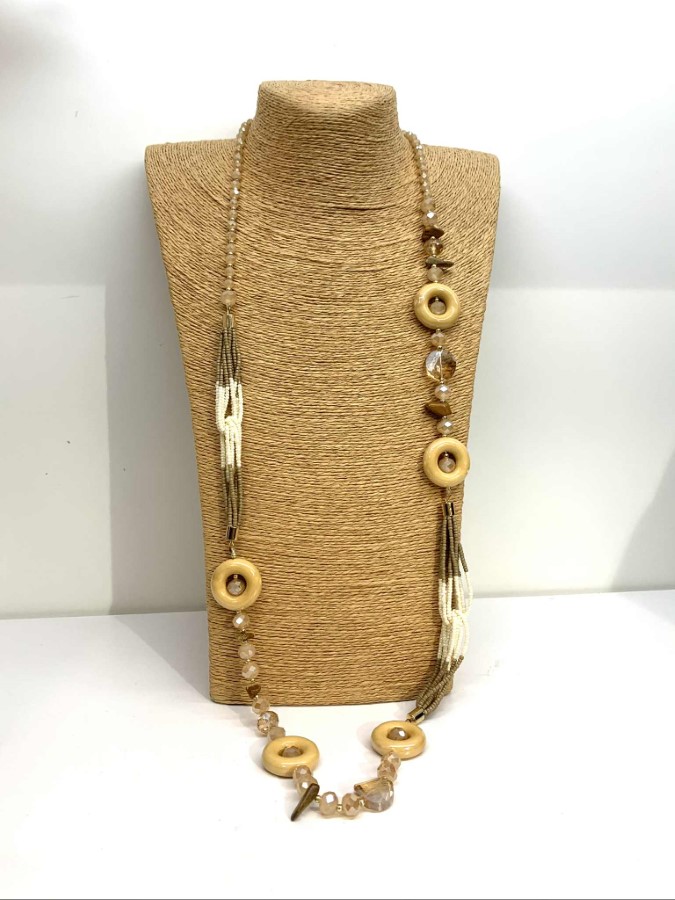 Material: Steklene perle, leseni dekorativni elementi, kovinski detajli in večnitna vrvica v naravnih odtenkih; lahka konstrukcija omogoča udobno nošenje skozi ves dan.