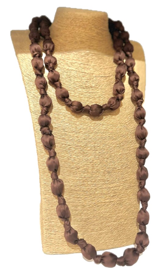 Elegantna ogrlica z rjavimi satenastimi kroglicami ponuja preprost, a sofisticiran videz. Zaradi edinstvene teksture in barve je odlična izbira za vsakodnevne kombinacije, a tudi za posebne priložnosti. S svojo dolžino in lahkotnostjo dodaja eleganco brez pretiranega sijaja. Ročno izdelana, natančno zasnovana za tiste, ki cenijo detajle in kakovost.