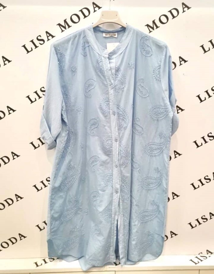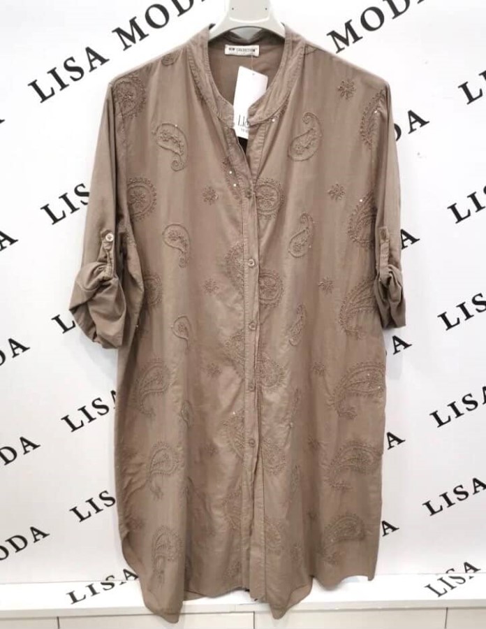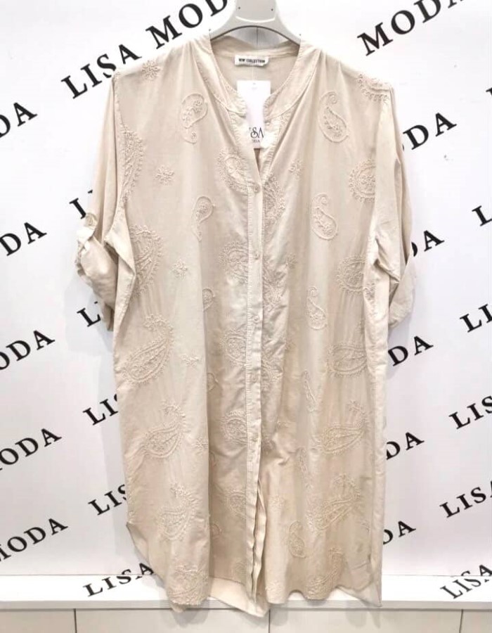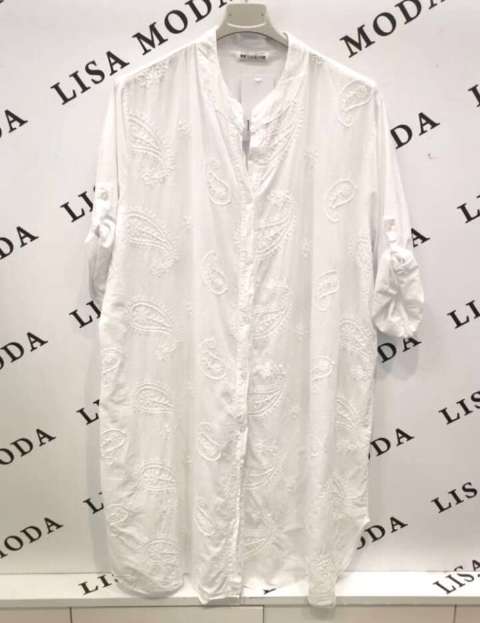 Elegantna srajca  z nežnim vezenim vzorcem. Izdelana je iz lahkega, gladkega materiala, ki je prijeten na dotik in zračen. Tkanina omogoča udobno nošenje ter ohranja obliko. Vezenina dodaja subtilno teksturo in prefinjen videz.