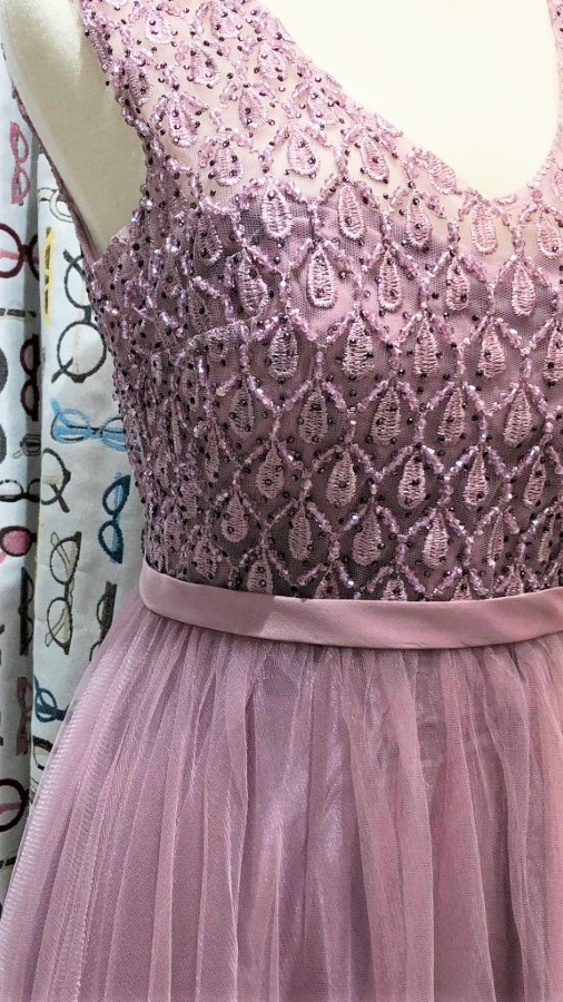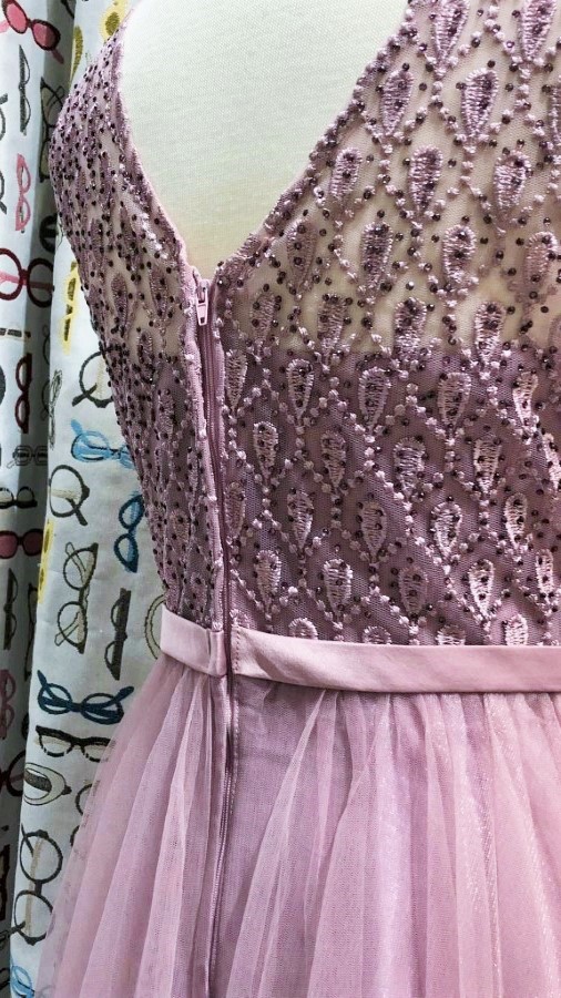 Zgornji del lepo objame postavo, medtem ko se tilasti spodnji del lahkotno razpira in ustvarja pravljičen volumen. Nežna roza barva dodaja pridih prefinjenosti, ki izžareva nežnost, milino in samozavest.