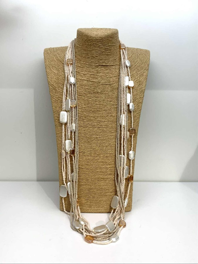 Ta elegantna večplastna ogrlica v nežnih naravnih tonih združuje prefinjen dizajn in brezčasno estetiko. Sestavljena je iz drobnih perl in večjih geometričnih elementov v toplih odtenkih bež, biserne in zlato-kovinske barve, ki ustvarjajo subtilen, a razkošen videz. Ogrlica je lahkotna, prijetna za nošenje in idealna za plastenje, hkrati pa dovolj izrazita, da samostojno dopolni tako vsakdanjo kot tudi bolj elegantno opravo. Popolna izbira za ljubiteljice unikatnih, butičnih kosov z značajem.