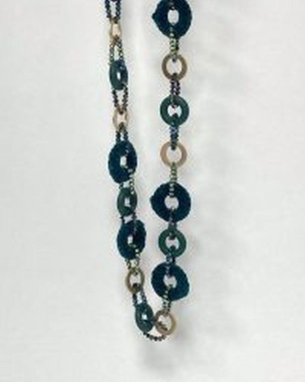 Dolga zelena ogrlica je lahka za nošenje in se zapenja na karabin v zlati barvi. Sestavljena je iz mehkih zelenih obročkov, zlatih obročkov in zelenih kristalčkov.