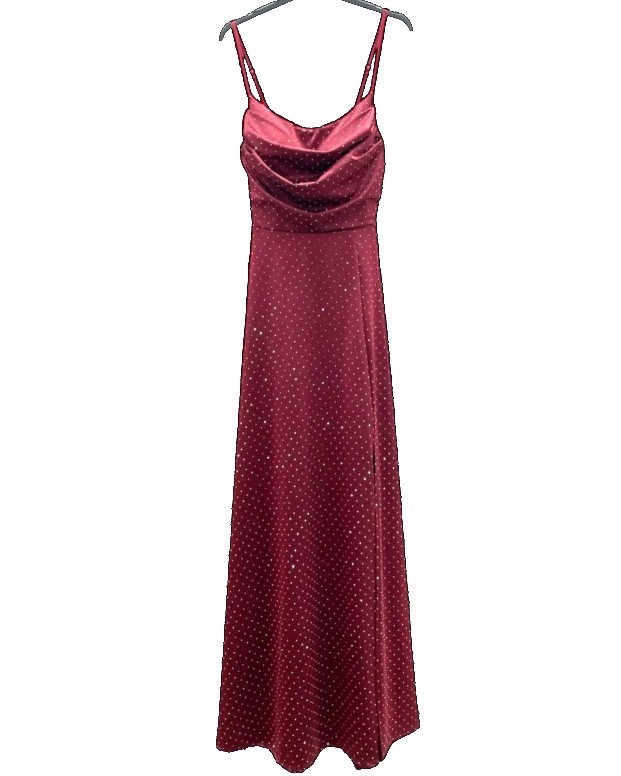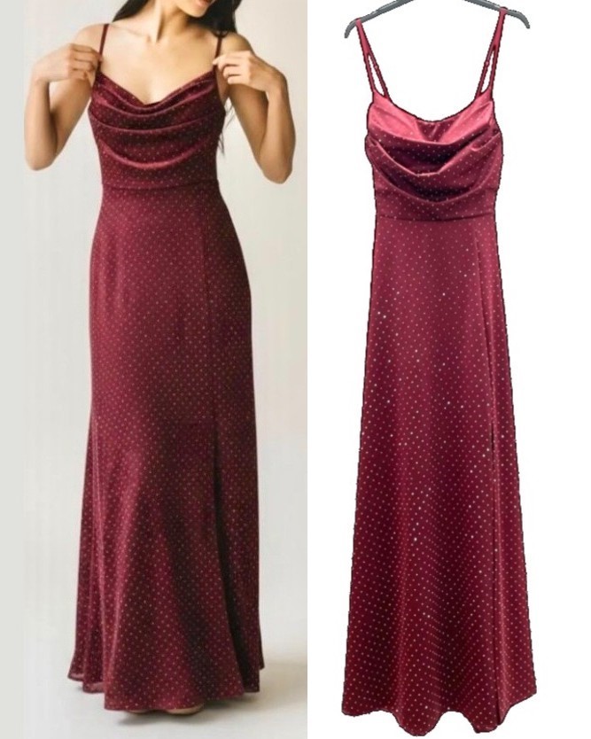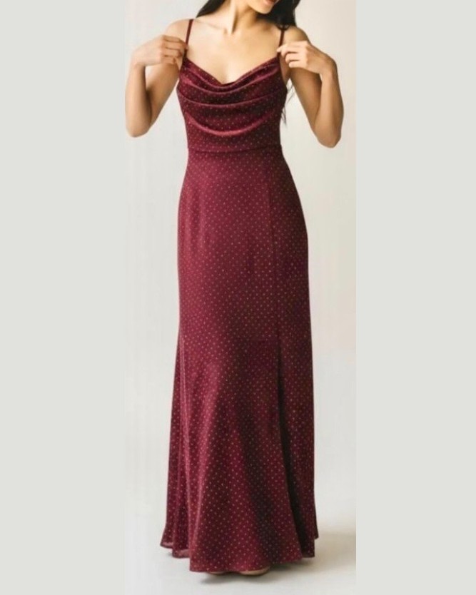 Zapeljiva in elegantna dolga obleka z naramnicami, ki čudovito poudari žensko silhueto. Obleka je izdelana iz mehko padajočega, gladkega materiala z drobnim pikastim vzorcem, ki doda pridih romantike in prefinjenosti. Drapiran izrez na dekolteju ustvarja ženstven in sofisticiran videz, tanjše naramnice pa poskrbijo za lahkotnost in eleganco. Kroj lepo sledi liniji telesa in se spodaj rahlo razširi, kar omogoča udobno nošenje in elegantno gibanje. Popolna izbira za večerne izhode, posebne priložnosti, poroke ali poletne dogodke.