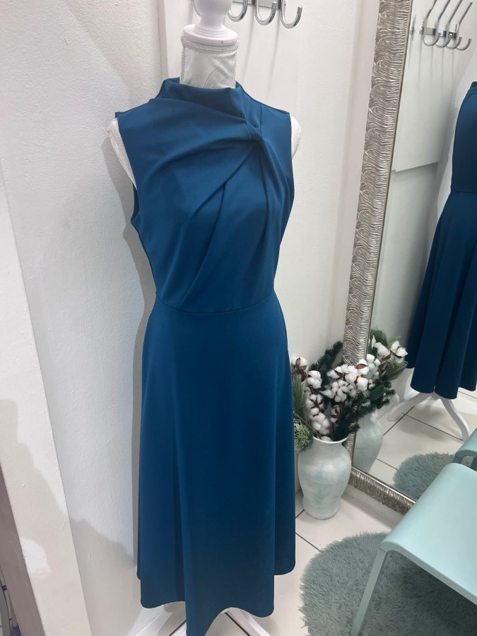 Obleka v prelepi modri barvi s subtilnim zategovanjem na vratu, ki ji daje sofisticiran videz. Narejena iz lahkotnega in udobnega materiala, se lepo prilega telesu in ima eleganten kroj, ki se spušča v rahlo širšo spodnji del. Idealna za posebne priložnosti ali večerne izhode, ta obleka združuje preprostost in eleganco ter omogoča enostavno kombiniranje z različnimi dodatki.