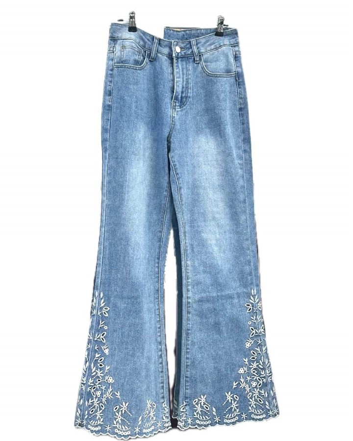 Modne jeans hlače z visokim pasom in rahlo razširjenim krojem navdušijo z nežnim vezenim vzorcem na spodnjem delu hlačnic. Klasičen denim videz je dopolnjen z ženskimi detajli, ki poskrbijo za poseben in trendovski stil. Izdelane so iz kakovostne mešanice 85 % bombaža in 15 % poliestra, kar zagotavlja udobje in obstojnost. Na voljo samo v velikosti S.
