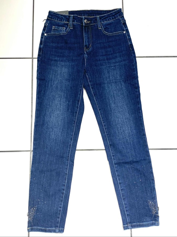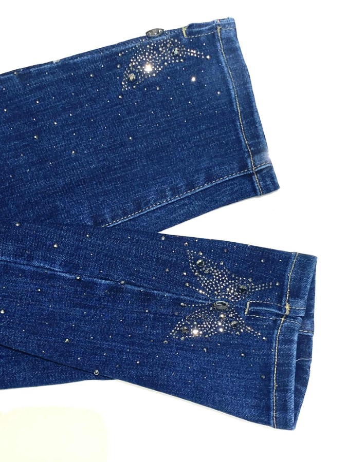 Oprijete jeans hlače z visokim pasom in edinstvenim detajlom – kristalčki v obliki metulja na spodnjem delu hlačnic.