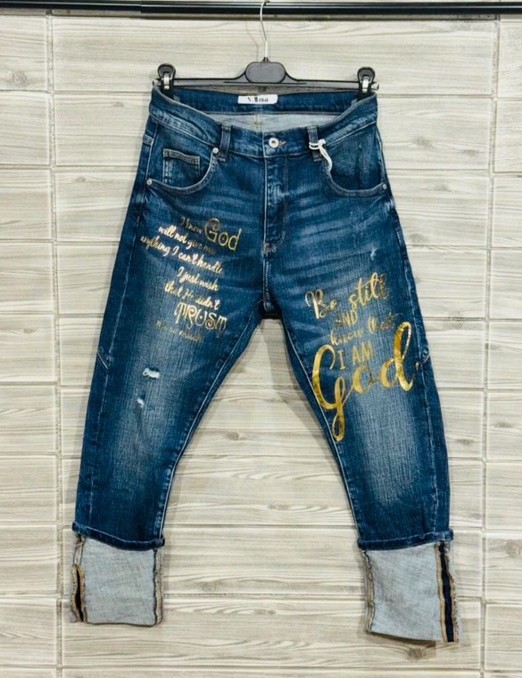 Sodoben kroj, klasičen denim in bleščeč zlat napis – popolna kombinacija za vse, ki želijo izstopati. Te kavbojke združujejo udobje in stil z edinstvenim detajlom, ki pritegne pogled.