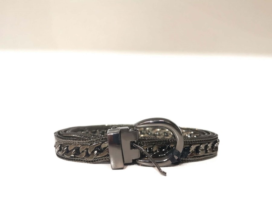 Trendovski pas z vpadljivimi kovinskimi detajli, ki vsakemu videzu doda modno noto. Prepleten vzorec in verižni elementi ustvarjajo drzno, a elegantno kombinacijo. Sijoča zaponka poskrbi za sodoben zaključek in varno zapenjanje. Idealen dodatek za popestritev oblek, tunik ali visokega pasu hlač.