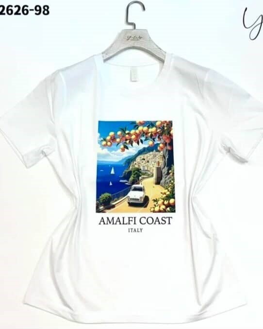 Ta kratka majica “Amalfi Coast” prinaša poletni občutek in mediteranski navdih v vaš vsakdan. S trendovskim potiskom in sproščenim krojem je popolna izbira za lahkotne, modne kombinacije. Mehka in zračna tkanina zagotavlja udobje, medtem ko dizajn doda pridih poletne elegance.