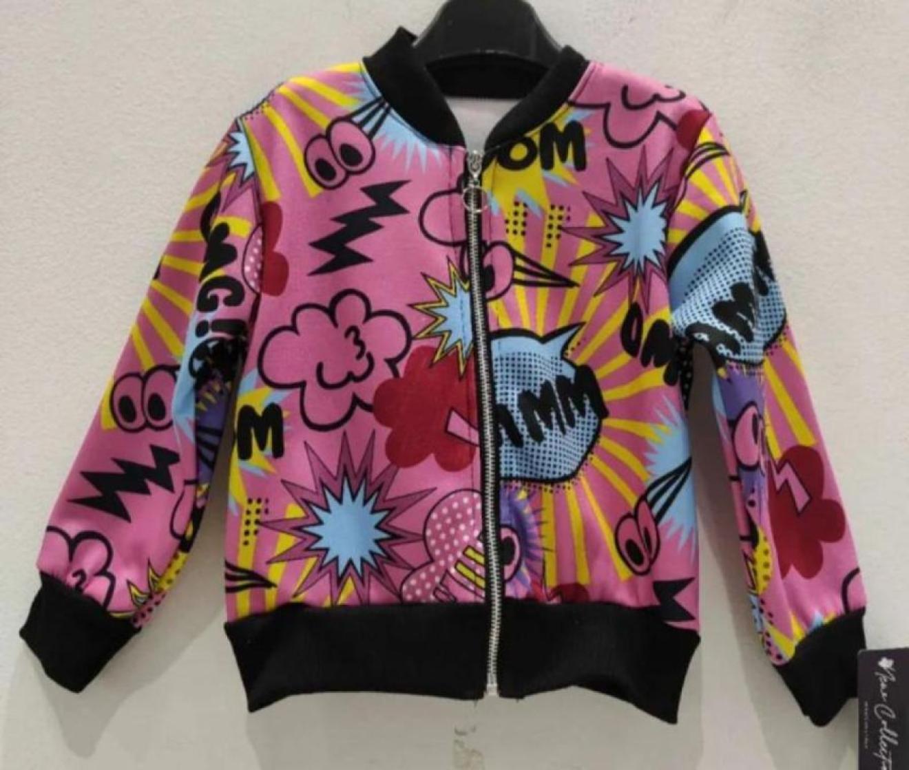 Otroška roza jopa na zadrgo s pisanimi motivi je iz mehkega materiala. Je malo debelejša, zato je zelo primerna za jesen.