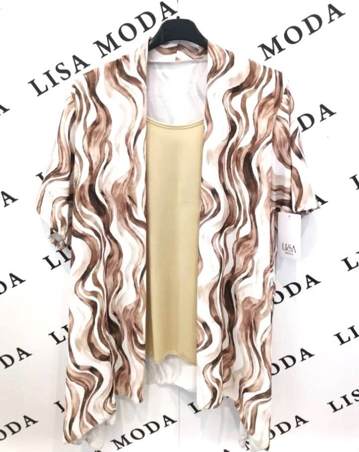 Zračen dvodelni komplet vključuje ohlapno tuniko in spodnji top za udobno plastenje. Tkanina je prijetna na otip, lepo pada in omogoča svobodno gibanje skozi ves dan. Krojen je tako, da elegantno dopolni različne stile, od vsakodnevnih do bolj urejenih priložnosti.