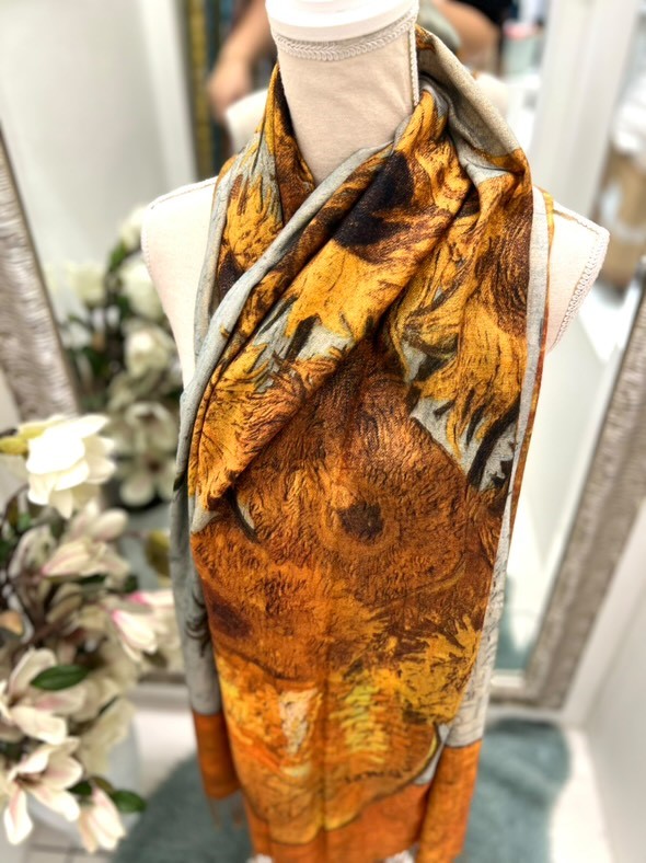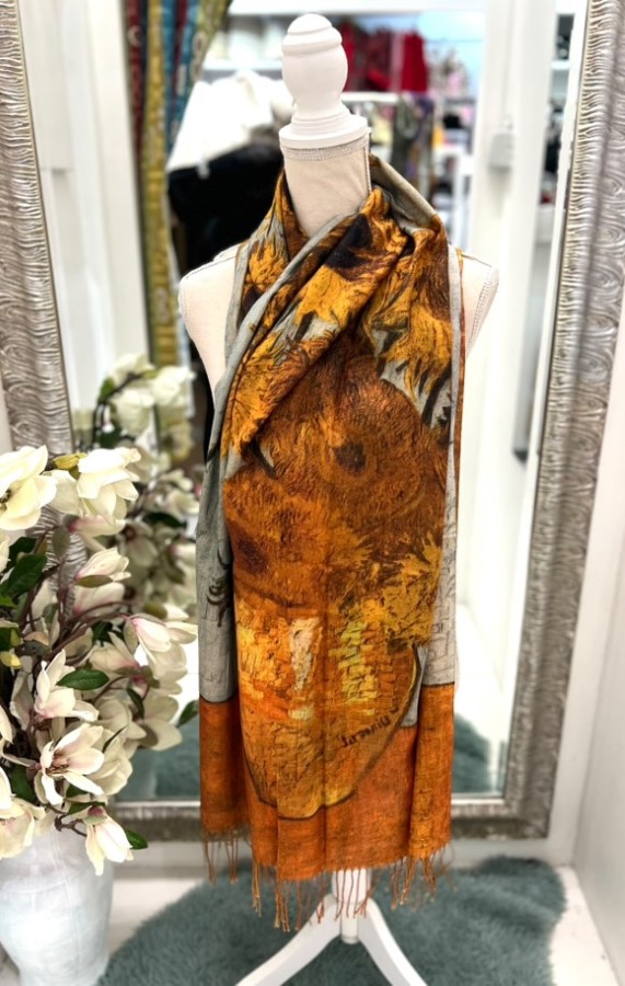 Topli odtenki oranžne in subtilna siva v enem šalu – popolna izbira za umetniški dotik vsakemu outfitu. Navdih iz Van Goghovih sončnic.