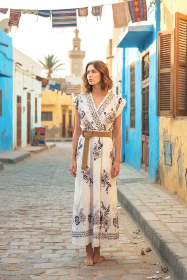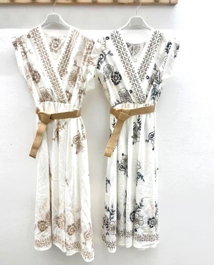 Zračna obleka z nežnim cvetličnim vzorcem in poudarjenim V-izrezom. Okrašena je z dekorativnimi detajli ob robovih in kratkimi rokavi. Pas poudari silhueto in poskrbi za ženstven videz. Idealna za lahkotne in elegantne kombinacije.