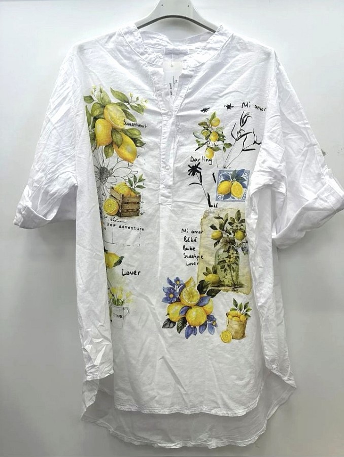 Lahkotna bela tunika z umetniškim limoninim potiskom in dekorativnimi napisi. Ima sproščen kroj, kratke rokave in rahlo podaljšan zadnji del. Izdelana je iz prijetnega, zračnega materiala za udobno celodnevno nošenje. Odlična izbira za svež, poletni videz.
