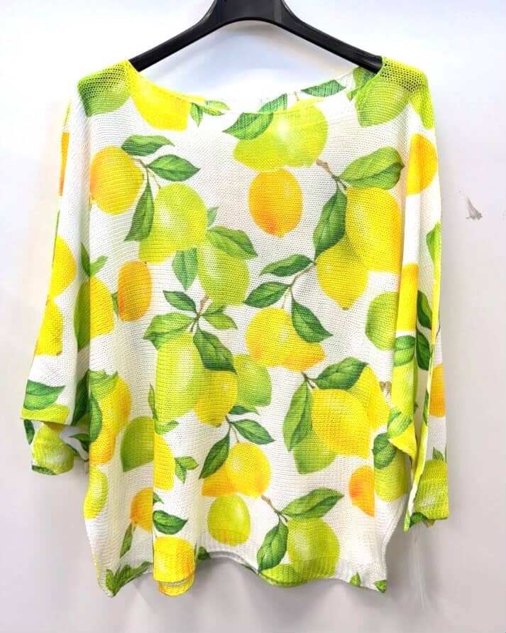 Majica z nežnim potiskom limon in zelenih listov, ki ustvarja naraven videz. Zračen material in sproščen kroj omogočata prijetno nošenje. Rahlo padajoča silhueta lepo pristaja različnim postavam. Idealen kos za lahkotne, vsakodnevne kombinacije.