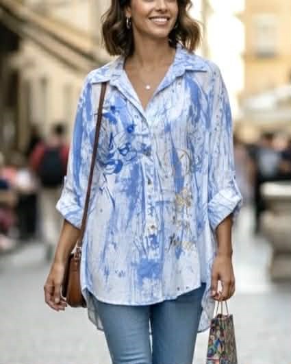 Lahkotna in udobna tunika s srajčnim ovratnikom je popolna izbira za sproščen, a urejen videz. Nežen potisk in padajoč kroj ustvarjata ženstveno silhueto ter omogočata udobno nošenje skozi ves dan. Rokavi z možnostjo zavihanja poskrbijo za dodatno prilagodljivost in stil. Model se odlično poda k različnim modnim kombinacijam.