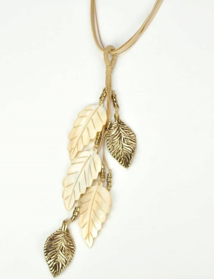 Dolga ogrlica z visečimi listi v krem barvi in kovinskih zlatih poudarkih. Listi so izdelani iz lahkega sintetičnega materiala, detajli pa iz kovinske zlitine v zlati barvi. Vrvica je tekstilna, mehka in prijetna na dotik. Ogrlica je lahka in udobna za nošenje.
