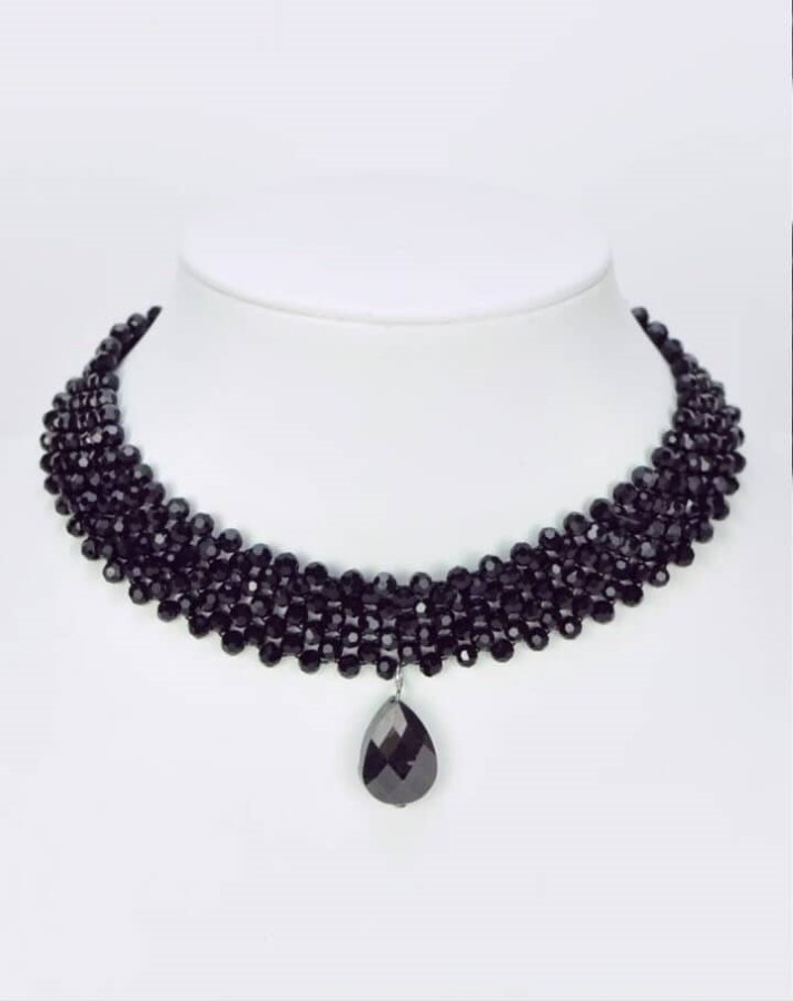 Elegantna ogrlica je izdelana iz več vrst drobnih temnih kristalnih perl, ki tvorijo bogat, prepleten ovratniški dizajn. V sredini jo dopolnjuje viseč kapljičast kristal z brušeno površino. Materiali ustvarjajo sijoč, prefinjen videz z izrazitim leskom. Kovinski zaključki zagotavljajo stabilnost in obstojnost.