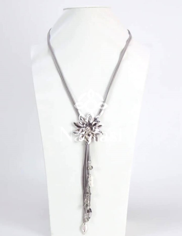 Elegantna ogrlica iz kovinske zlitine v srebrnem tonu z izrazitim cvetličnim motivom. Osrednji dekorativni element je oblikovan kot cvet z visečimi podaljški, ki dodajo gibanje in prefinjen videz. Verižica je toga in gladko zaključena, kar poudari sodoben dizajn. Material: kovinska zlitina s srebrnim premazom.