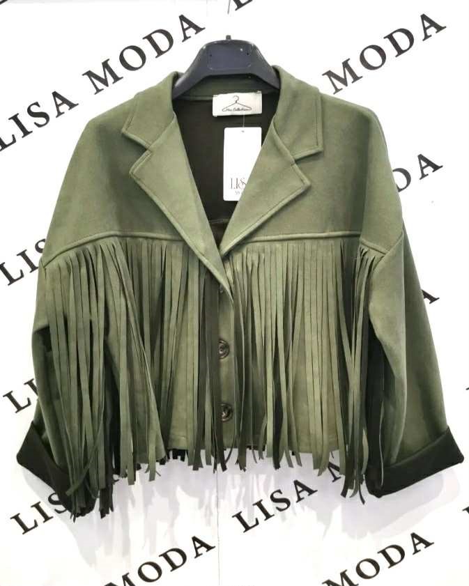 Sodoben boho pridih v brezčasni olivni barvi. Kratka jakna z igrivimi resicami doda karakter vsakemu outfitu – popolna za prehodne dni in večerne slojevite stile.