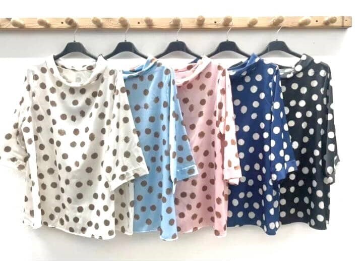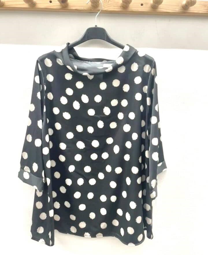 Lahkotna bluza s klasičnim pikastim vzorcem in sproščenim krojem. Izdelana je iz prijetnega, zračnega materiala, ki nudi udobje skozi ves dan. Kratki rokavi in rahlo valovit rob dodajo ženstven in igriv videz. Popolna izbira za vsakodnevne in elegantnejše kombinacije.