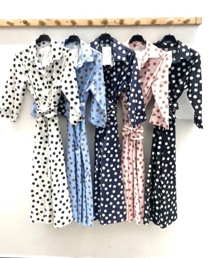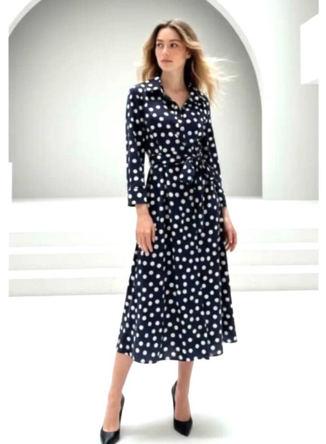 Elegantna midi obleka z igrivim pikčastim vzorcem in klasičnim ovratnikom. Ima dolg rokav ter pas v pasu, ki lepo poudari silhueto. Mehko padajoč material zagotavlja udobno nošenje skozi ves dan. Popolna izbira za ženstven in brezčasen videz.