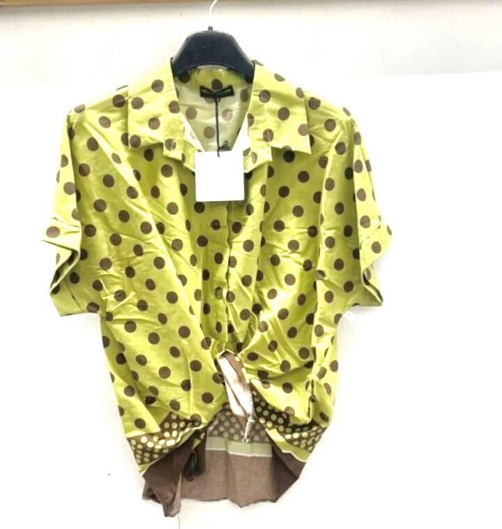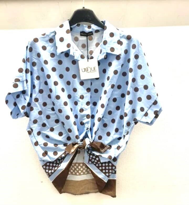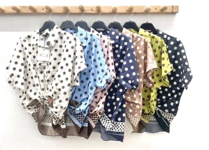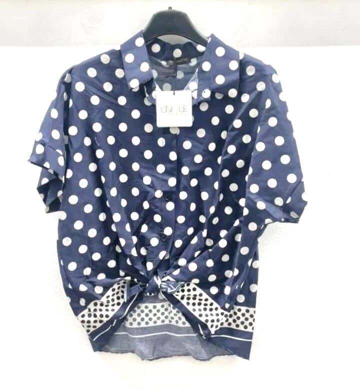 Moderna srajca s kontrastnim pikastim vzorcem in dekorativnim vozlom spredaj. Mehka tkanina omogoča udobno nošenje in lepo prileganje telesu. Kratki rokavi in sproščen kroj ustvarjajo mladosten in igriv videz. Na voljo v različnih barvnih različicah.
