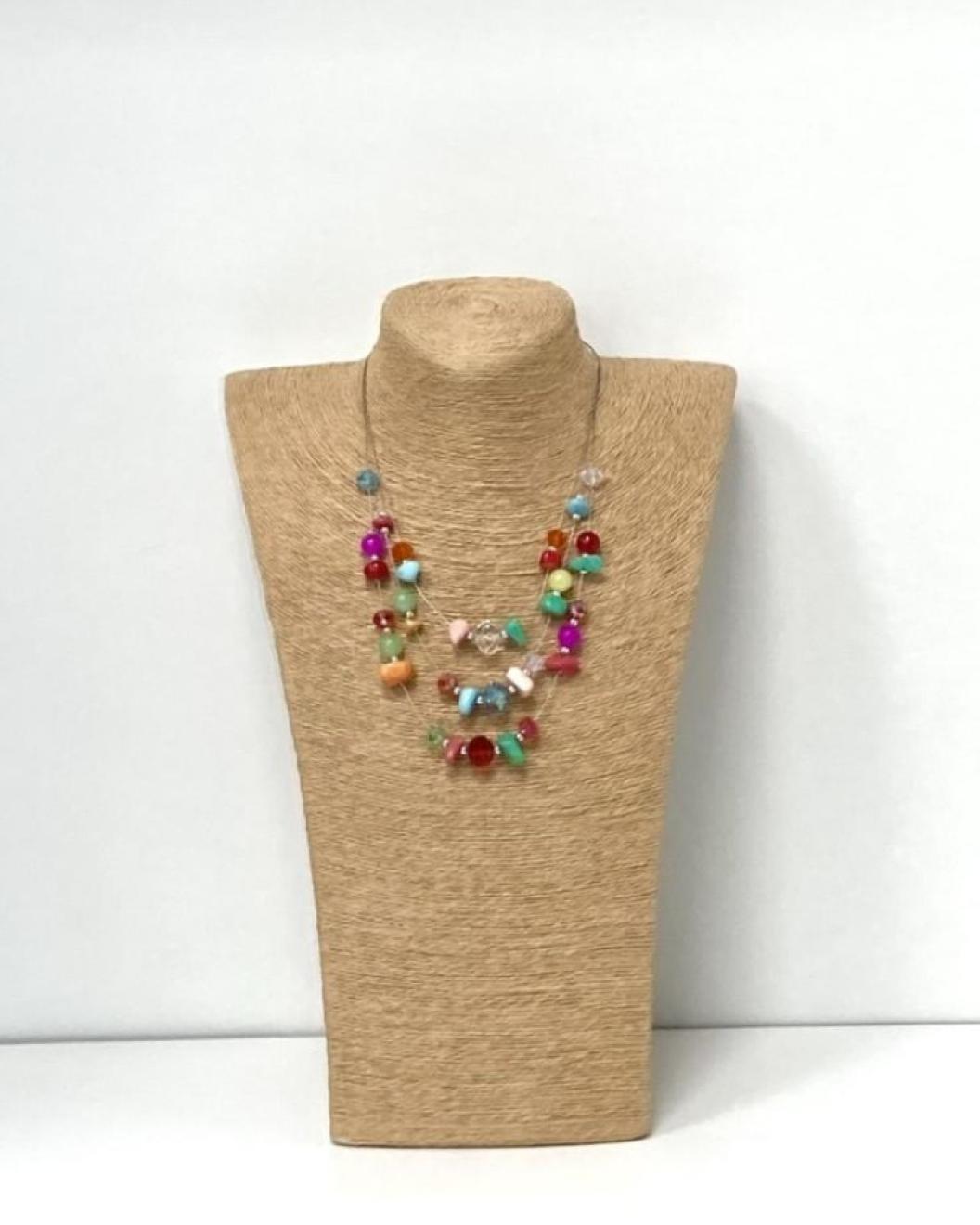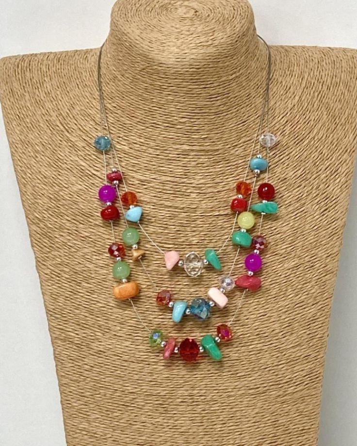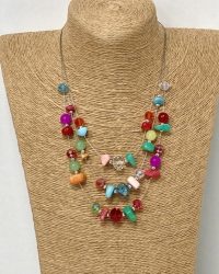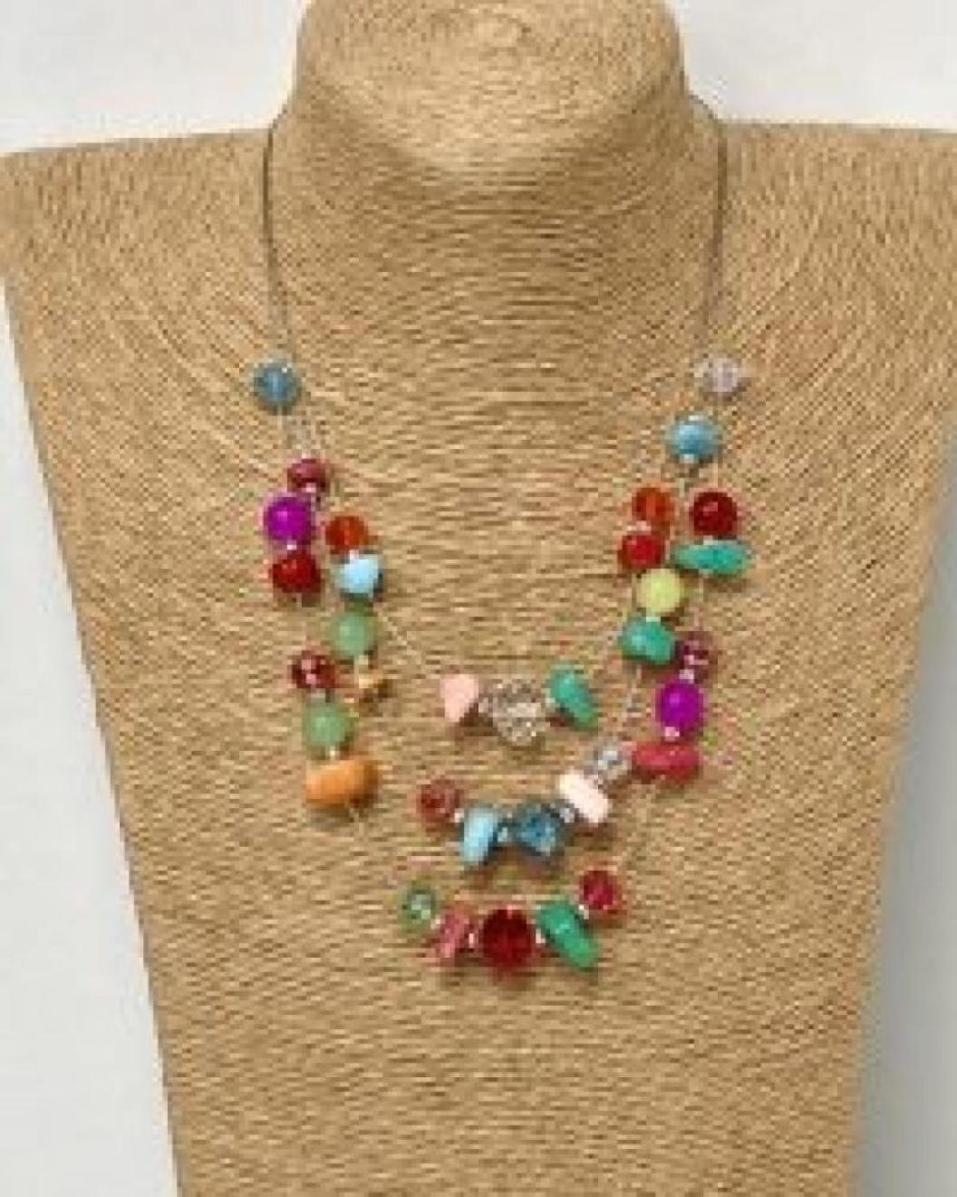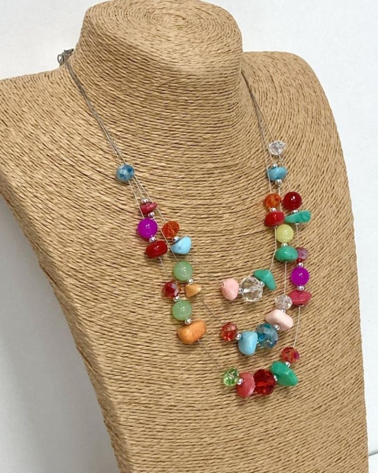 Ogrlica je sestavljena iz treh vrvic v srebrni barvi na katerih so nanizani kamenčki različnih barv med katerimi so tudi majhne srebrne kroglice. Zapenja se na karabin, ki je prav tako v srebrni barvi.